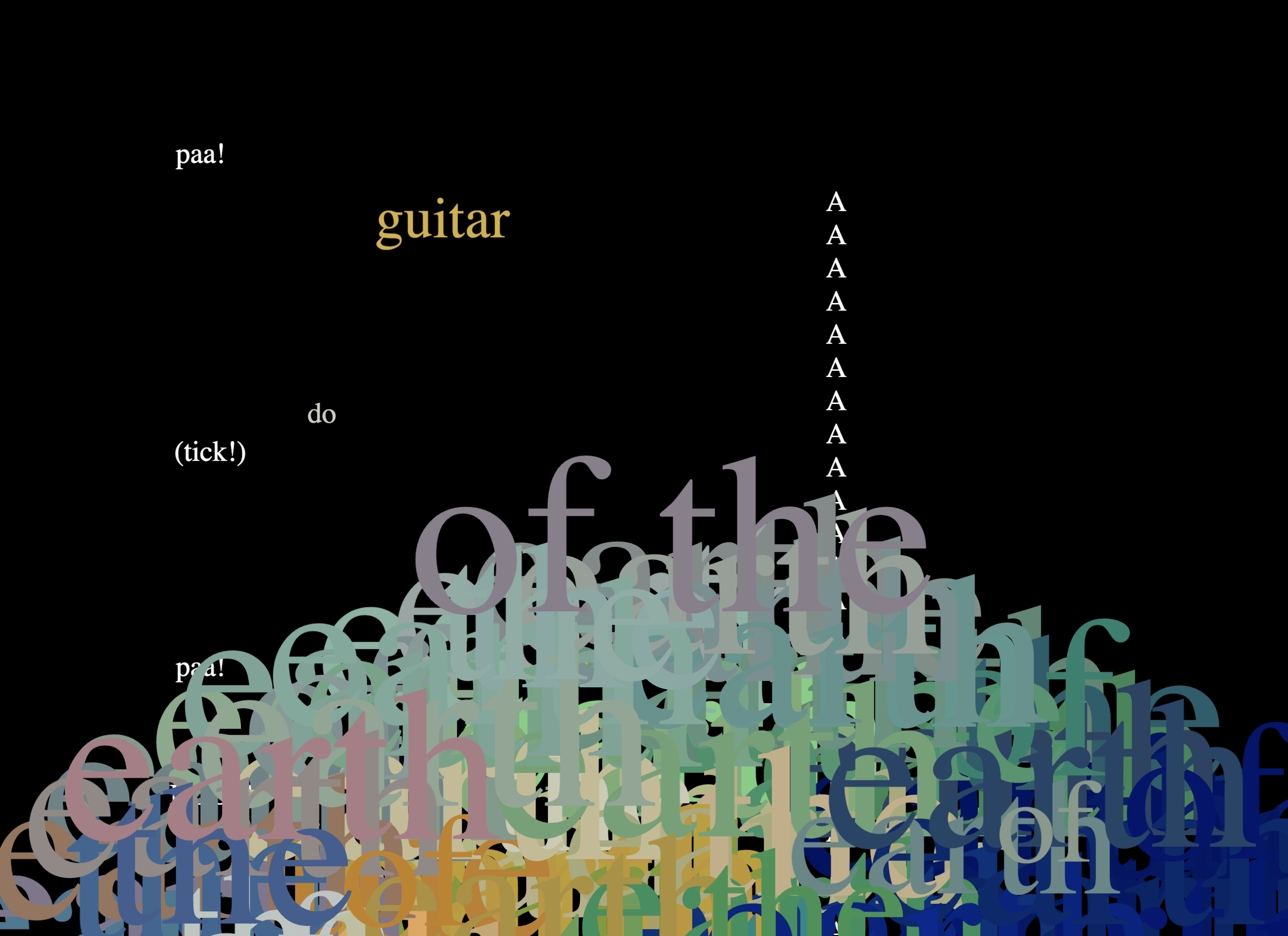 this project took me about 2 weeks to finish. there's only 80 lines of javascript code for the music playback, but there are 9,654 html tags placed in different places with different colors and sizes. i wrote a python script to help me with the instruments, but a lot of it was done by hand. the larger word clouds were rendered by a rust program i wrote that takes png files and converts them to a list of text objects. the source code for that is here: https://codeberg.org/aaaash/fishes.